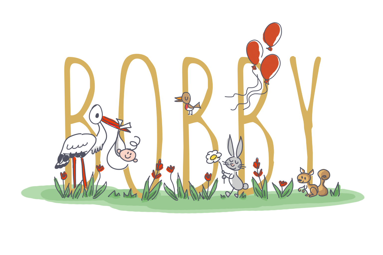Een vrolijk geboortekaartje voor jouw kleintje. Het liggende kaartje heeft een okergele binnenkant. Op de voorkant staat groot de naam van jullie kleintje. Om de letters heen zie je een ooievaar met baby in het hoge gras, een konijn, een eekhoorn tussen de bloemen, ballonnen in de lucht. Pas het kaartje naar wens aan in onze online editor.