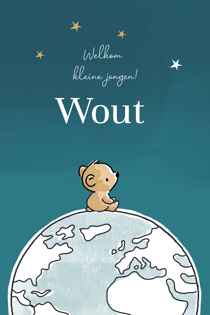 Dit is een mooi kaartje voor de geboorte van je zoon. Een beertje zit op de wereldbol te kijken naar de sterren met daartussen de naam in goudfolie. Het kaartje is helemaal naar wens aan te passen in onze online editor.
