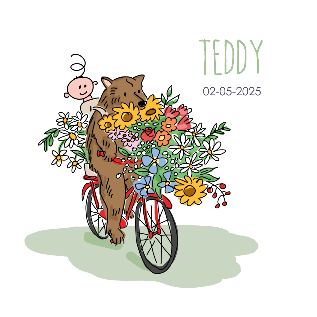 Wat een vrolijk geboortekaartje. Op dit ontwerp zie je een beer op de fiets vol met kleurrijke bloemen. Deze grote lieve beer is onderweg op de fiets met jullie kindje achterop. Pas het kaartje naar wens aan in onze online editor.