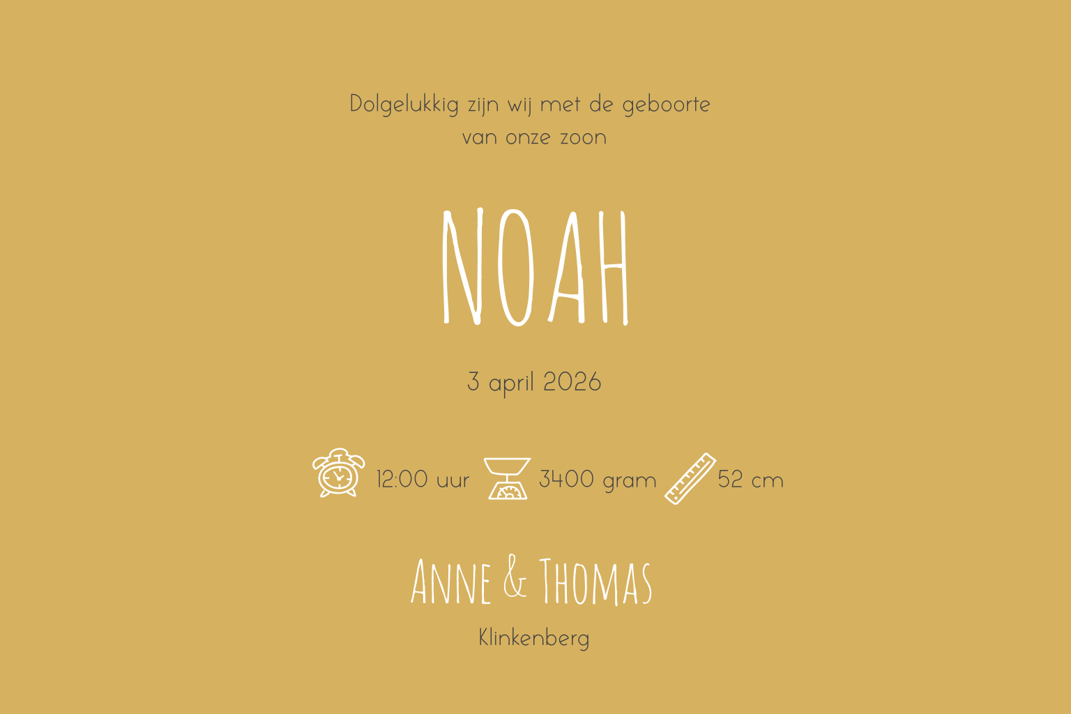 Vrolijk geel geboortekaartje met naam en illustraties van bosdieren