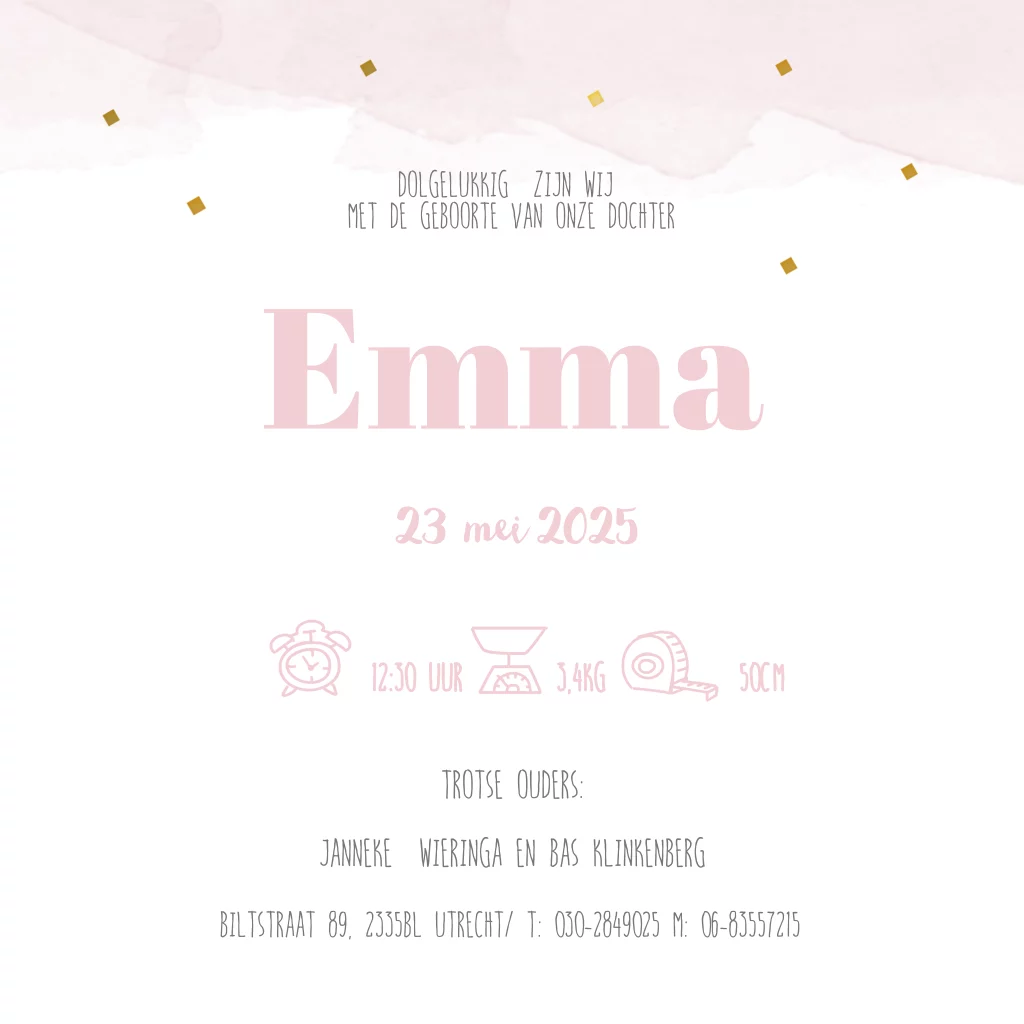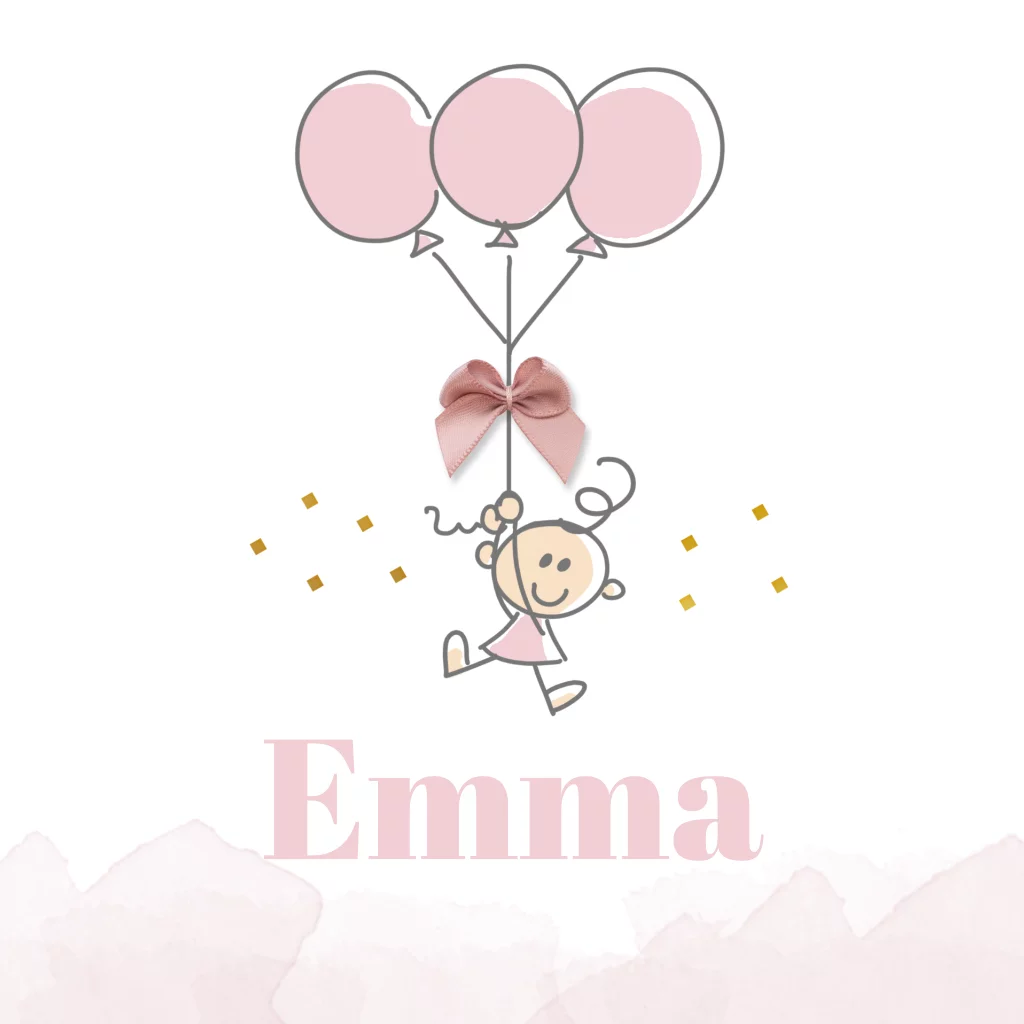 Een lief geboortekaartje met een klein meisje met ballonnen en een écht zachtroze strikje! Leuk zijn de kleine ruitjes in goudlook en de roze watercolourverf. Op de achterkant is een illustratie van een ooievaar, ontworpen door designster Babette.