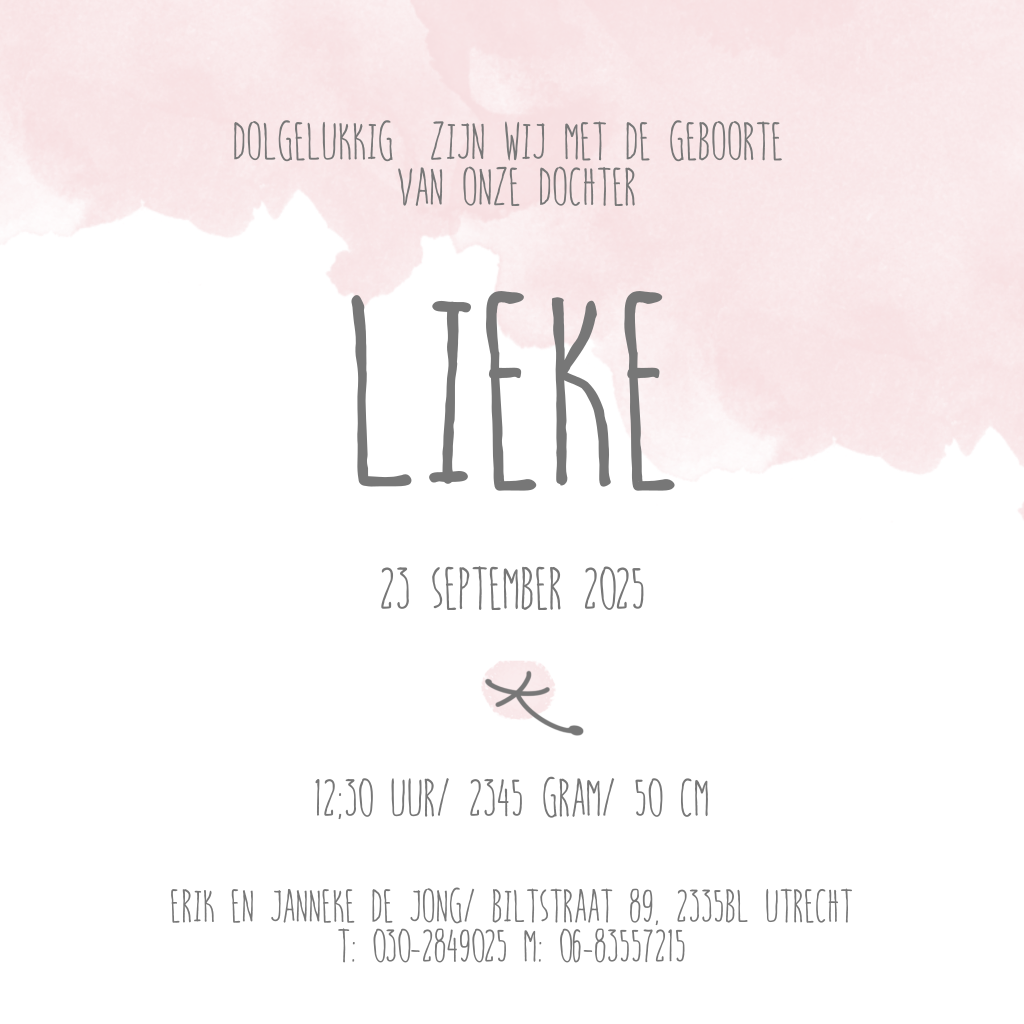 Wat een schattig geboortekaartje met al die dwarrelende paardenbloempluisjes! Dit hippe kaartje met roze watercolour is leuk voor een meisje. Lettertypes kun je zelf uitkiezen en aanpassen!