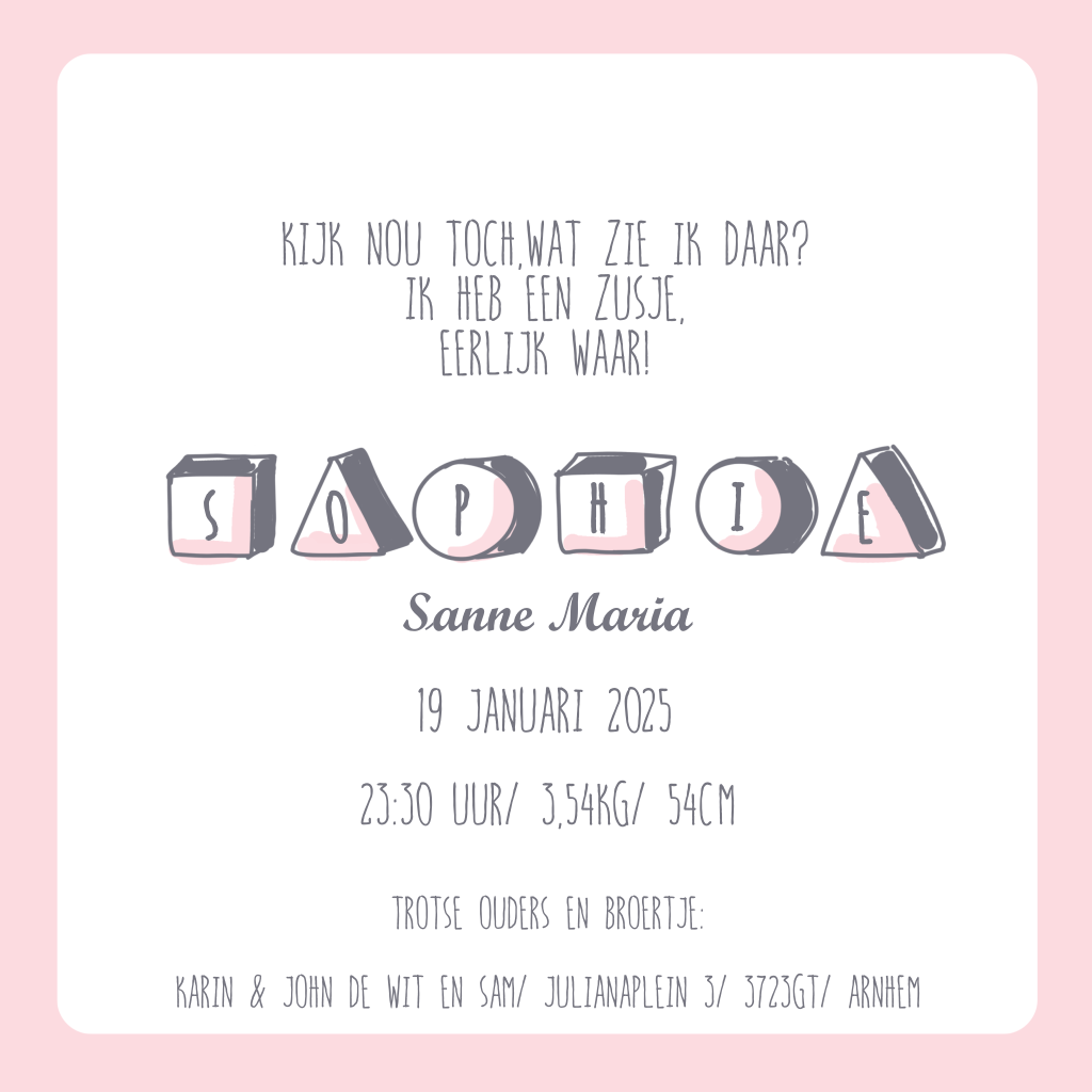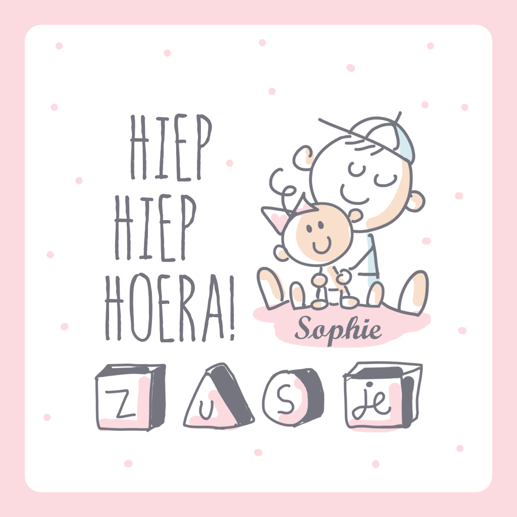 Schattig geboortekaartje voor een meisje met een grote broer. Dit kaartje heeft lieve illustraties zoals een broer die met zijn kleine zusje met de blokken speelt.