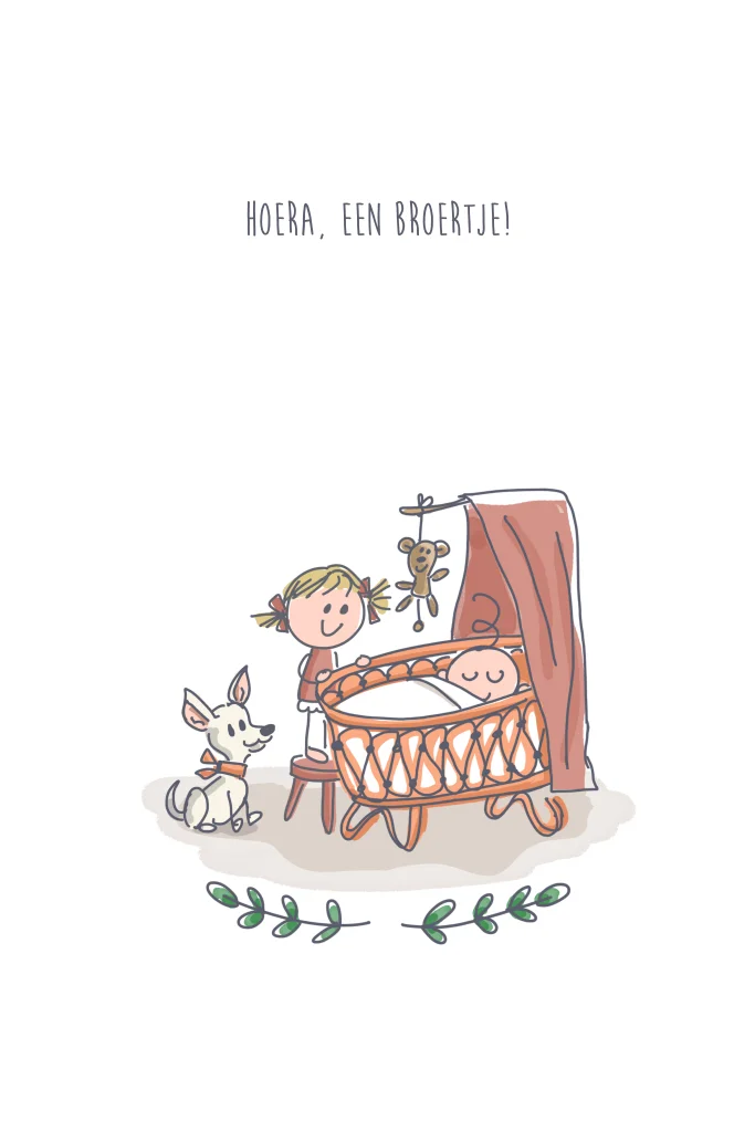 Een schattig geboortekaartje voor de geboorte van jullie tweede kindje. Het kaartje heeft een tekening van een grote zus die samen met de hond naar het wiegje kijkt. De naam van jullie kleintje wordt in goudfolie bovenaan de kaart gedrukt.