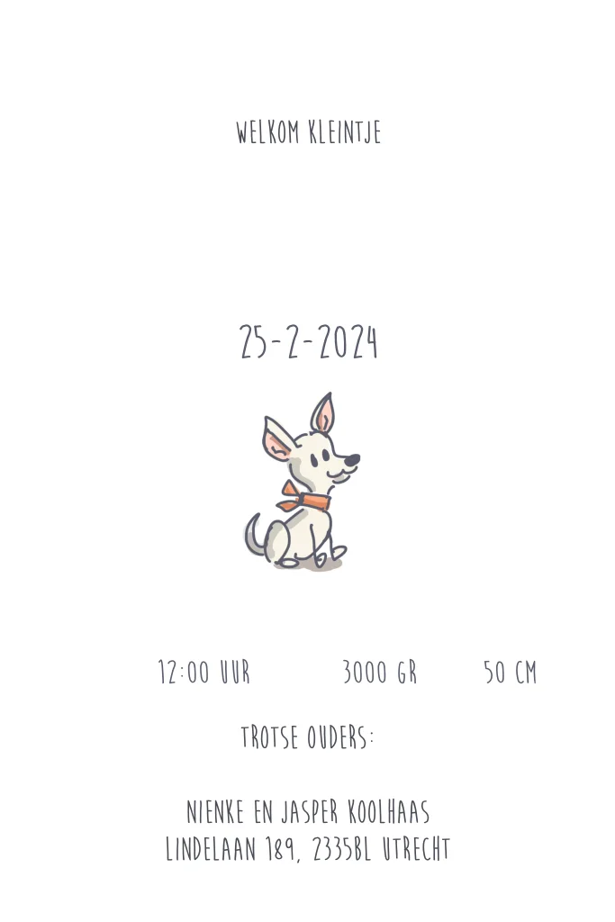 Personaliseer dit schattige geboortekaartje voor een broertje of zusje met een eigen huisdier in onze online editor. In de editor heb je keuze uit verschillende soorten hondjes, een poes of goudvis. Dit ontwerp bestaat ook in een grote broer variant.
