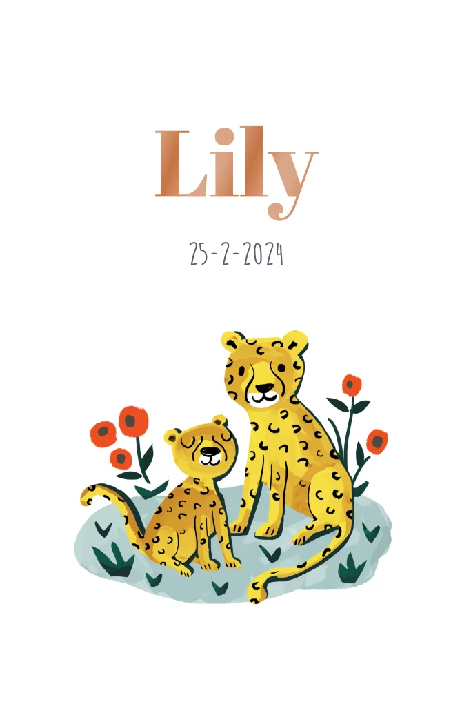 Lief geboortekaartje met hoogglans voor je zoontje of dochtertje. Op het kaartje staan in het gras tussen bloemen en blaadjes twee tijgertjes. Gaat het hier om broertje en zusje? Of misschien mama of papa met kindje? Voor eigen invulling interpreteerbaar. Met de naam in prachtig hoogglans. Geschikt voor een jongen of een meisje.