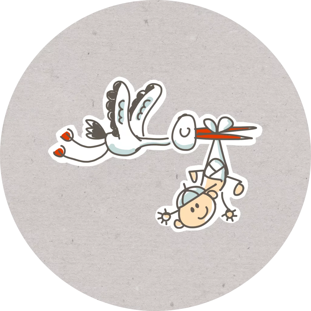 Een vrolijke sluitsticker met grijze achtergrond. Op de voorgrond zie je een vrolijke illustratie van een ooievaar met baby.