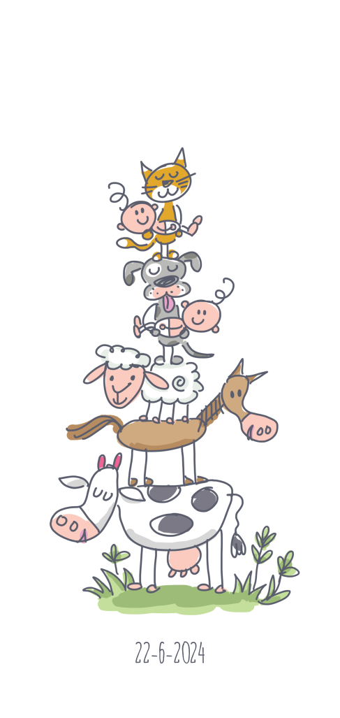 Een vrolijk geboortekaartje om jullie tweeling mee aan te kondigen. Op het kaartje staat een stapel boerderijdieren die pronkt met de tweeling. Bovenin houden poes en hond ieder een baby in zijn armen terwijl koe, paard en schaap de basis van de toren vormen. Een origineel geboortekaartje met dieren in een langwerpig formaat. De namen staan in goudfolie gedrukt.