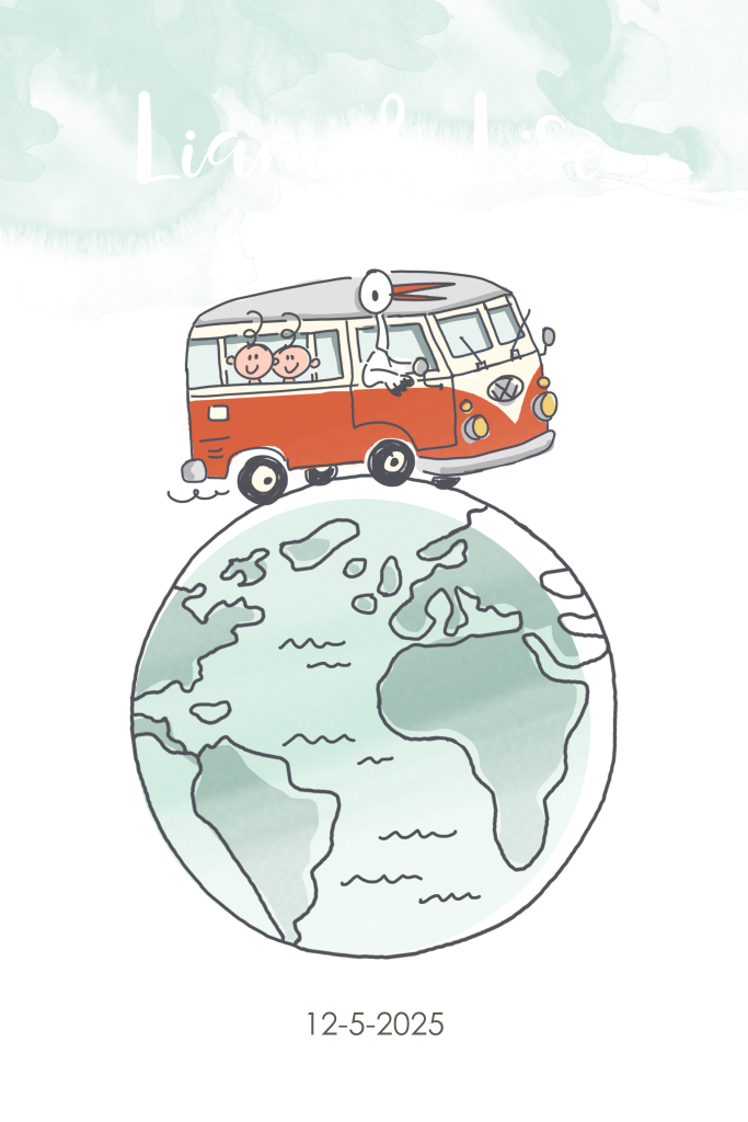 Vrolijk goudfolie geboortekaartje voor tweeling met busje op wereldbol