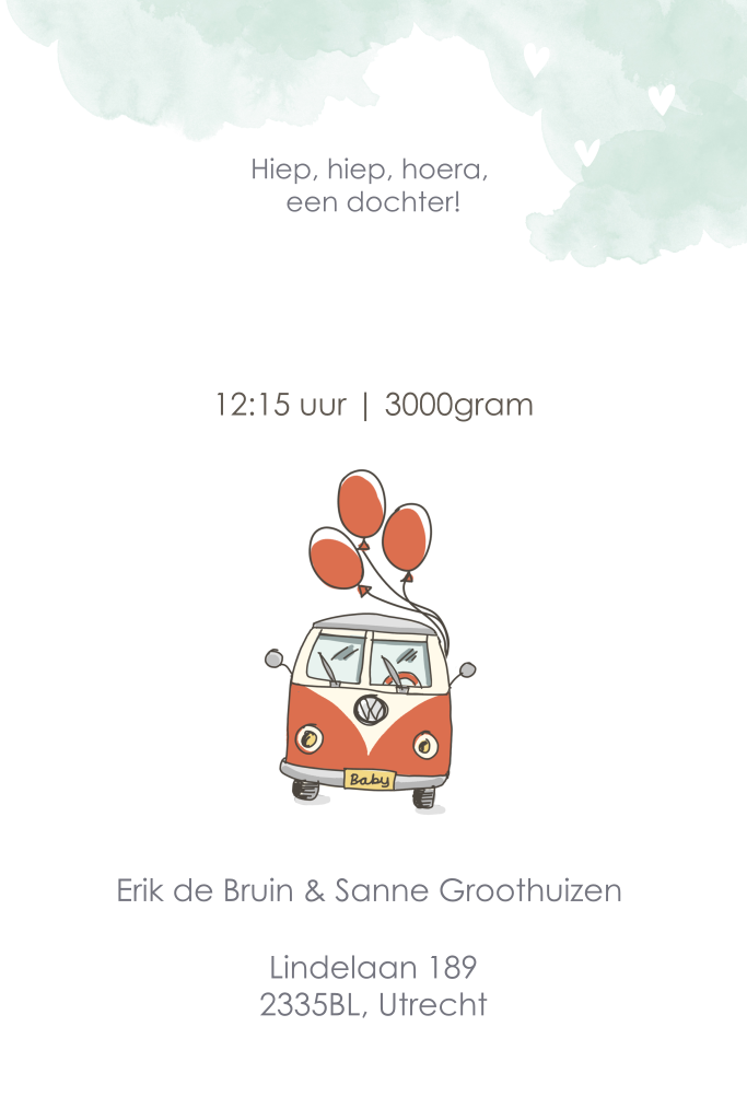 Vrolijk en origineel geboortekaartje om je tweeling mee aan te kondigen. De tweeling wordt op de wereld gebracht door de ooievaar in Volkswagen busje. De namen van je tweeling en de hartjes zijn in goudfolie gedrukt. Binnenin wordt de kaart opgevrolijkt door ballonen.