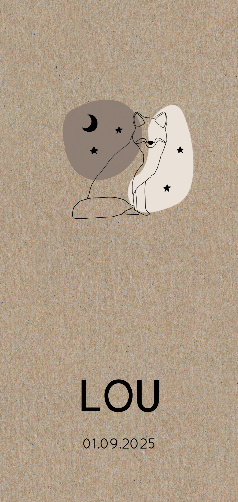 Stoer geboortekaartje op echt kraft karton met een hippe tekening van een vos op een achtergrond met organische vormen, sterretjes en maantje.