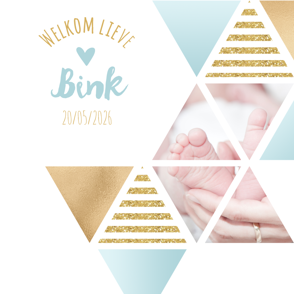 Trendy geboortekaartje jongen met driehoeken in blauw en goudlook. Plaats je eigen foto gemakkelijk achter het fotoframe.