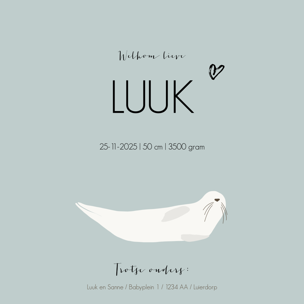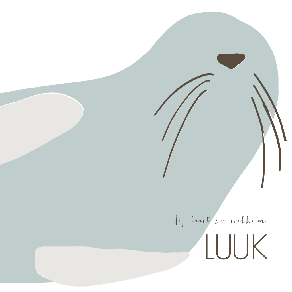 Hip geboortekaartje voor de geboorte van je zoon met een illustratie van een lieve zeehond in grijsblauw.