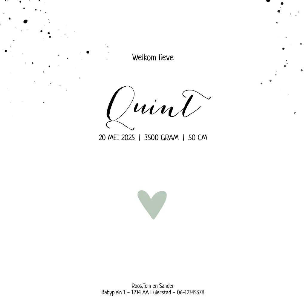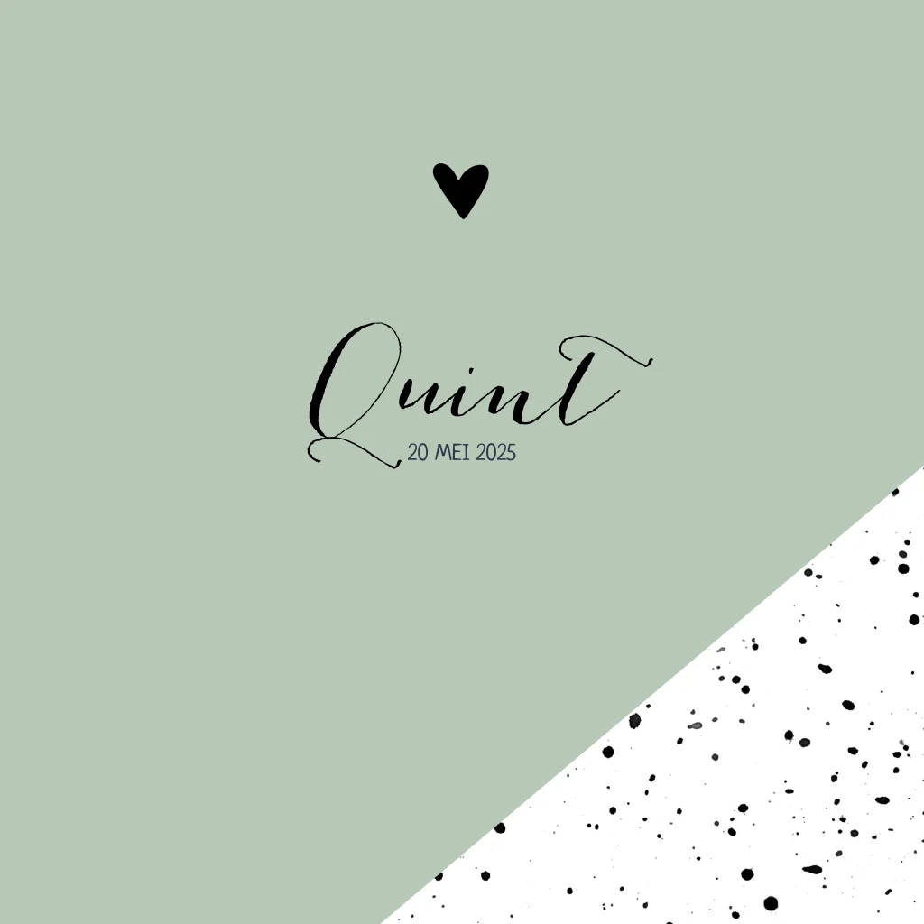 Modern geboortekaartje voor een jongen groen met zwarte verfspatten
