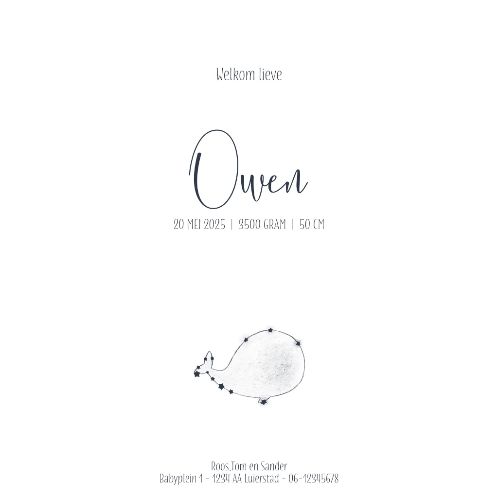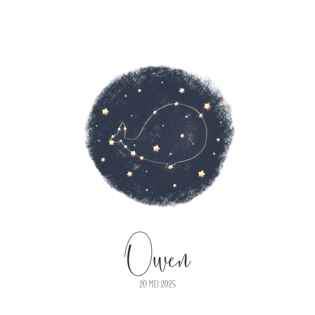 Origineel geboortekaartje voor je zoon. Met dit hippe walvis sterrenbeeld past dit kaartje helemaal bij de huidige trends!