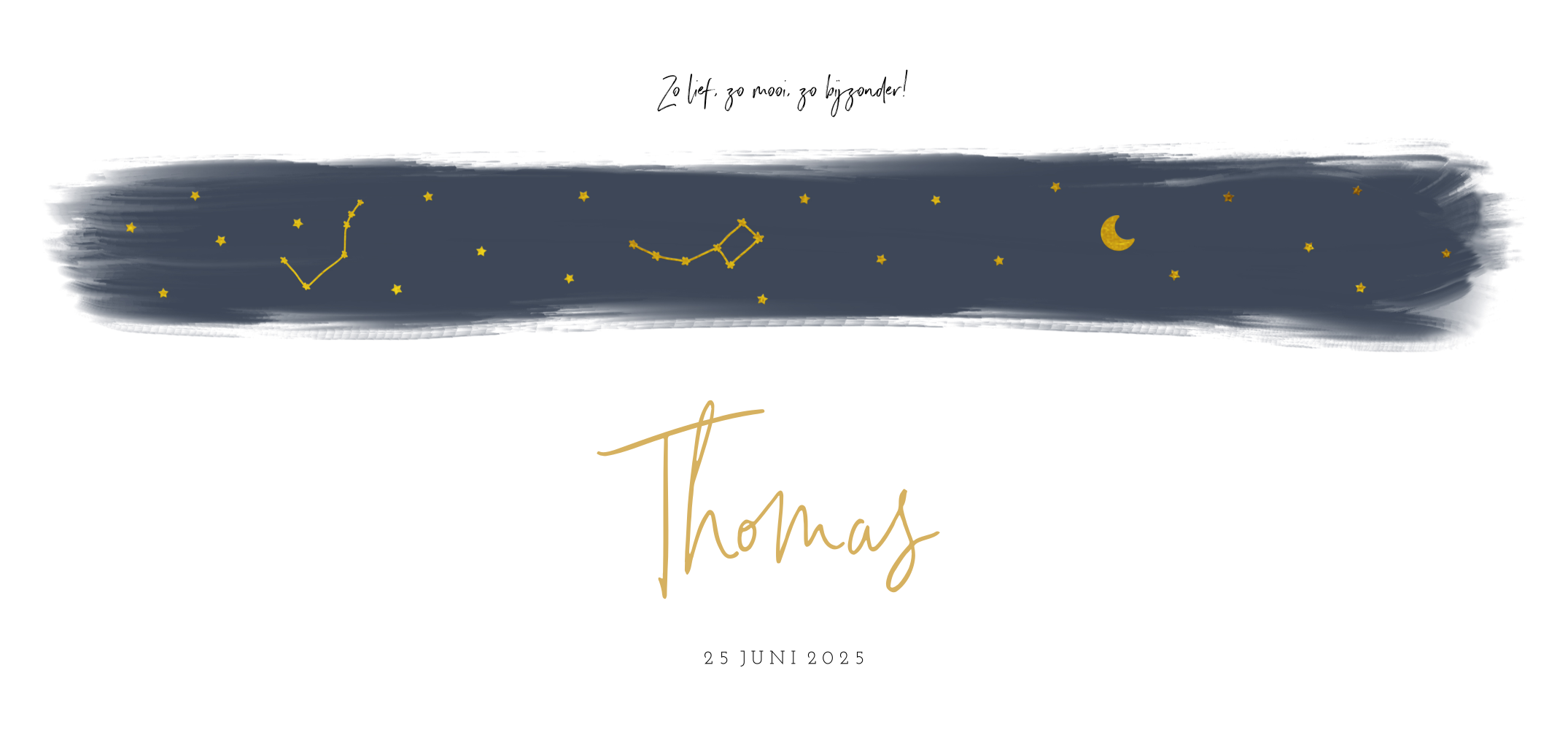 Uniek en stoer geboortekaartje voor je pasgeboren zoontje met een donkerblauwe verf streep met daarin goud-look illustraties van sterretjes, de maan en sterren beelden. Verander de kaart door de teksten en kleuren aan te passen en maak een unieke kaart!