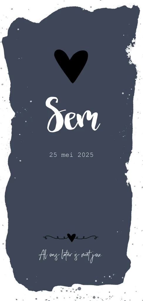 Ben je opzoek naar een geboortekaartje voor een stoer klein ventje? Dan is dit kaartje echt wat voor jou! Met een hippe donker grijze verf achtergrond en een zwart hartje is dit echt een jongens kaartje. Pas de kleuren aan en verander de teksten om de kaart uniek te maken!