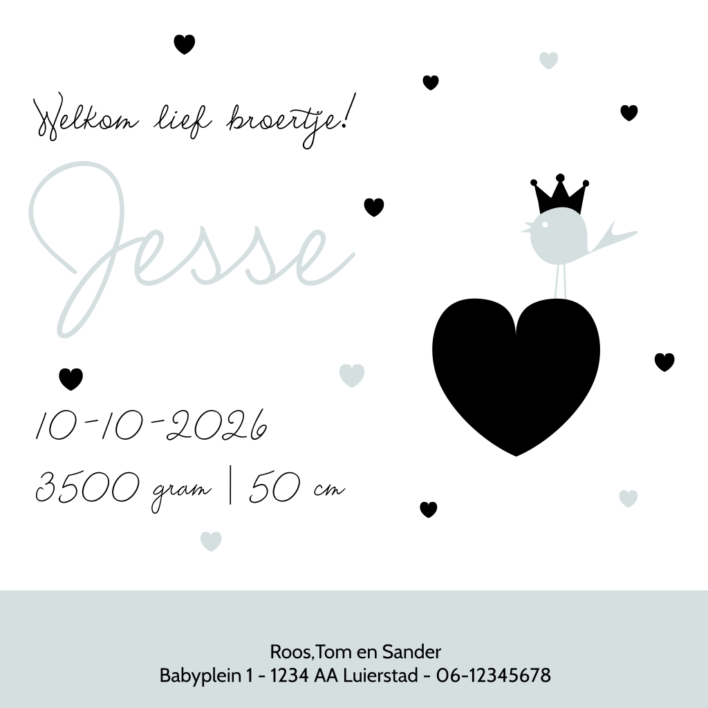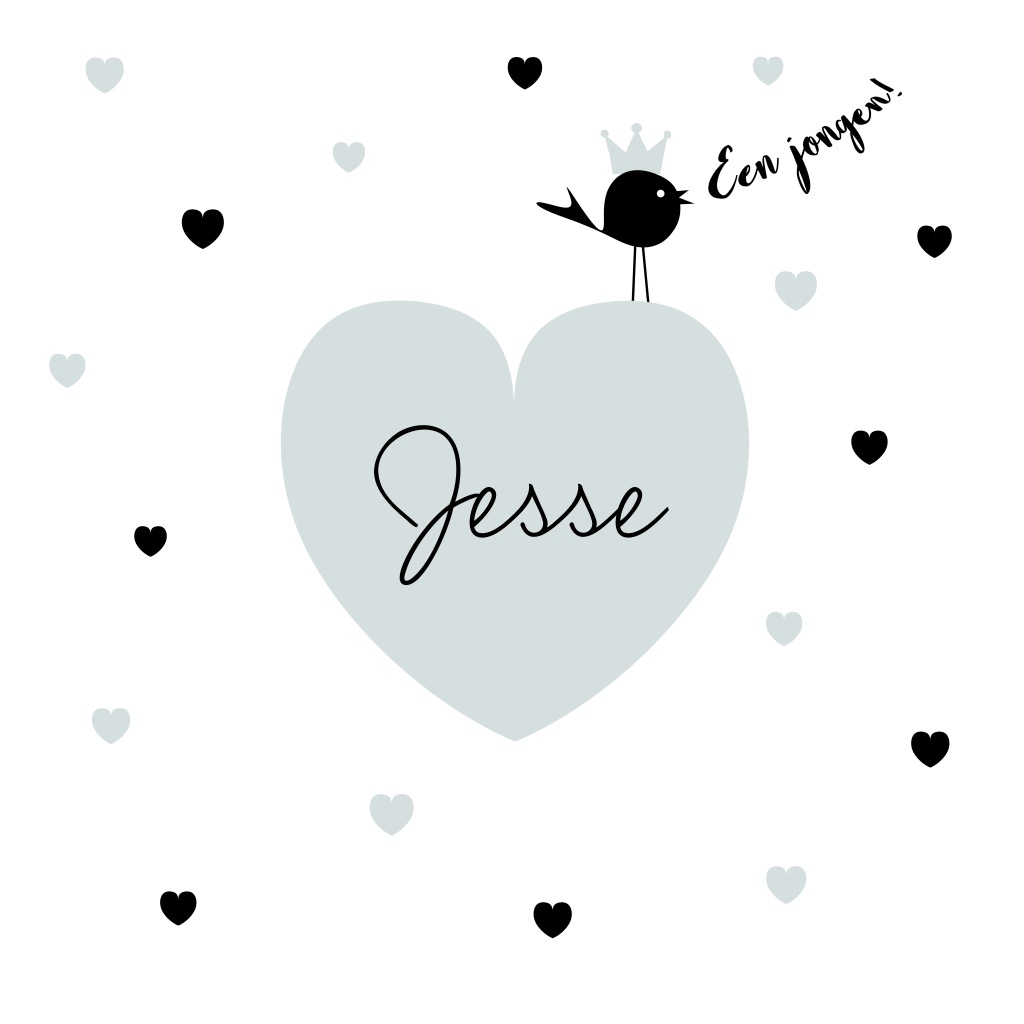 Hip geboortekaartje voor jongens met hartjes en vogeltje in pastel groen en zwart-wit.