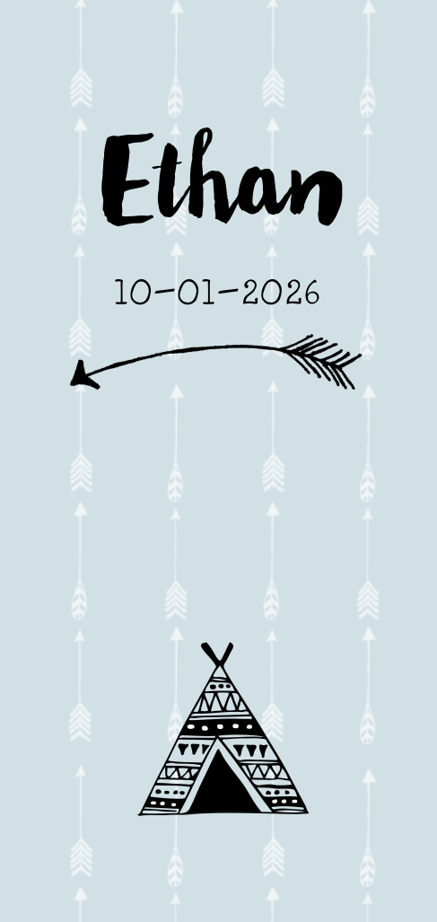 Extra lang model jongens geboortekaartje in bohemian stijl met pijlen en tipi in licht blauw. Pas naar wens de kleuren van het kaartje aan.
