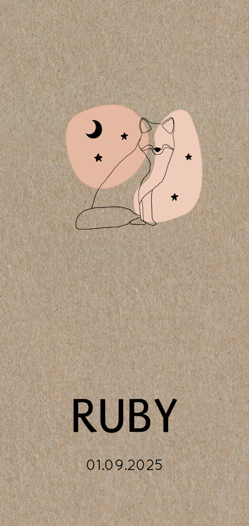 Trendy geboortekaartje van echt kraftkarton voor je pasgeboren dochter. Met stoere lijntekening van een vos op een achtergrond van organische vormen in natuurlijke tinten, sterretjes en een hip maantje.
