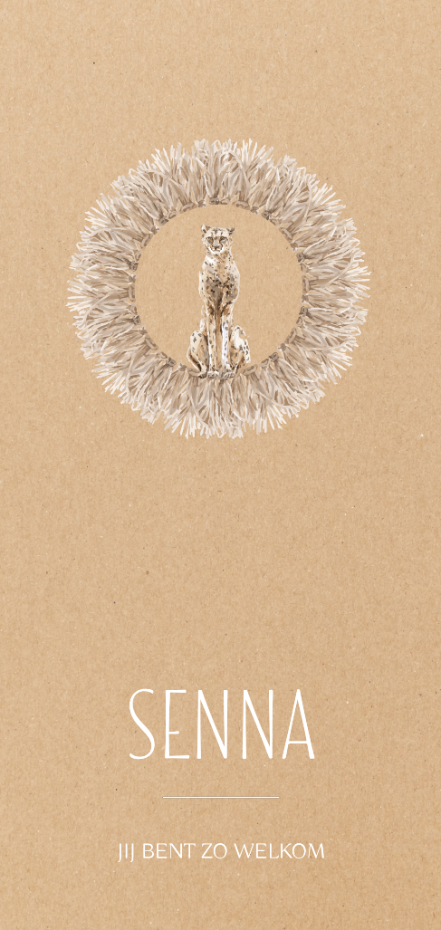 Stoer geboortekaartje op echt kraftpapier voor de geboorte van je zoon of dochter met cheetah in een krans van riet.