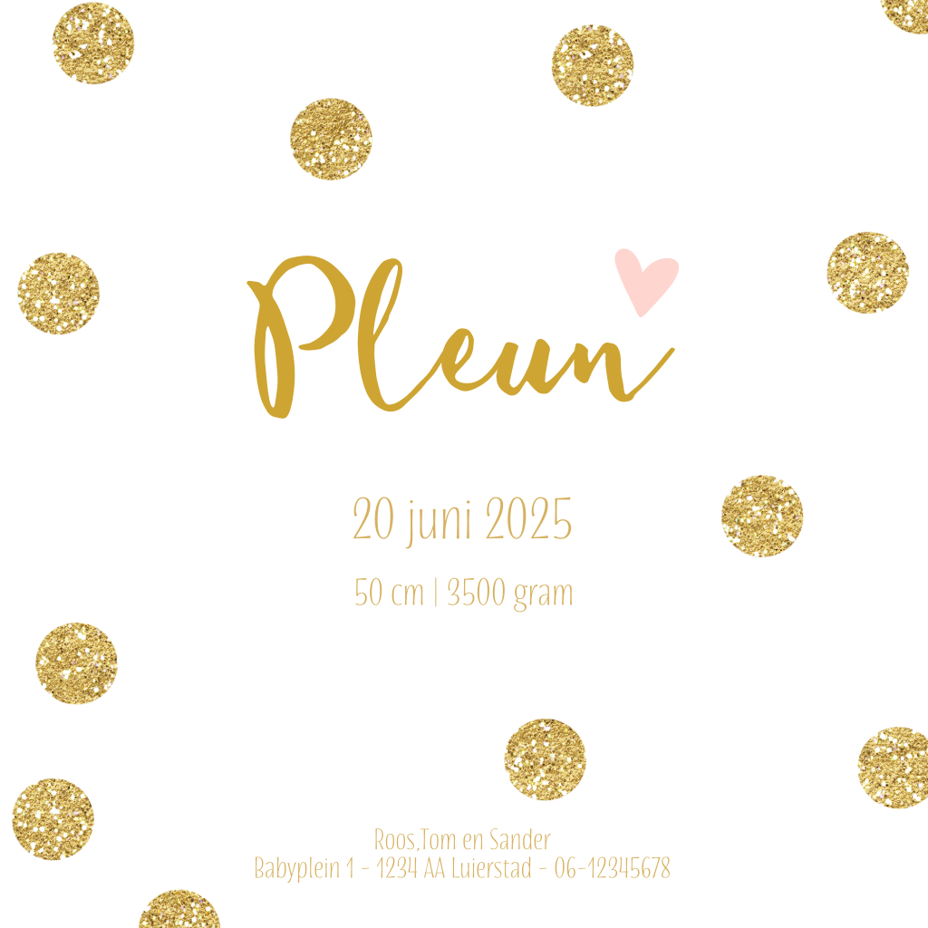 Hip geboortekaartje voor je dochter met glitterconfetti in perzikroze en goudlook. Je kunt de kleuren van de kaart helemaal zelf aanpassen.