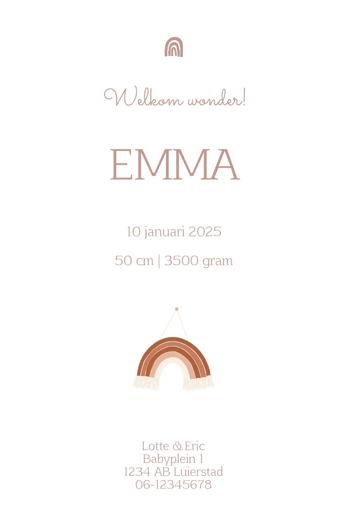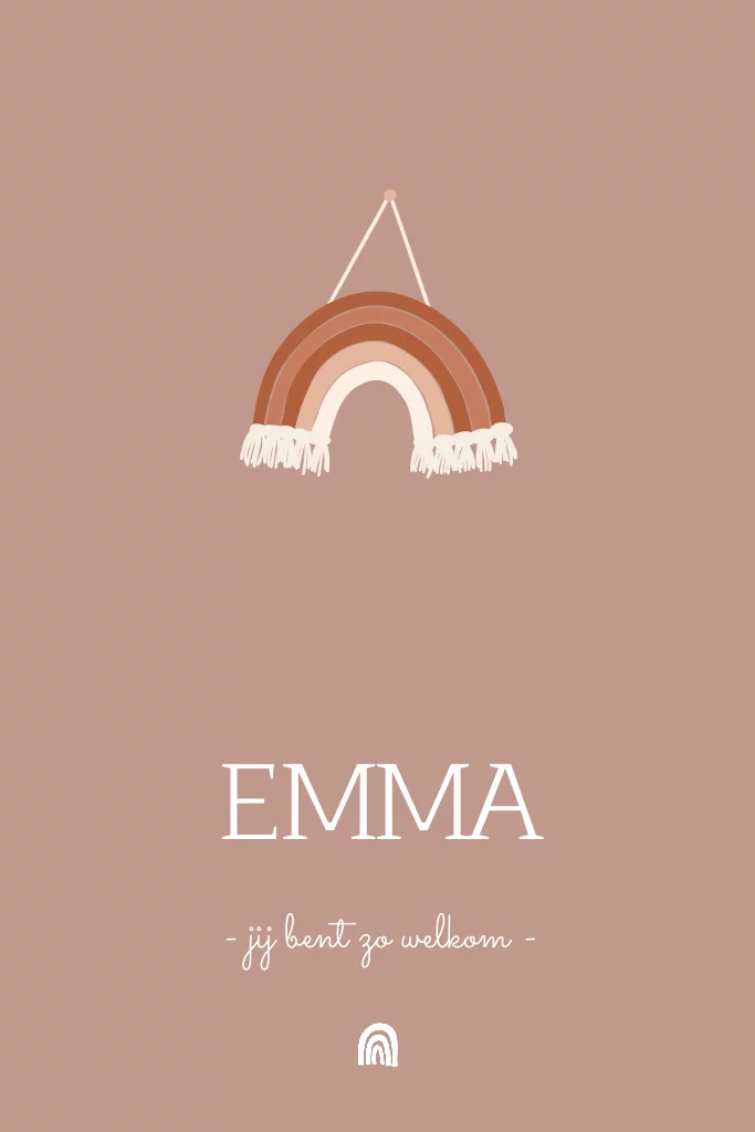 Misschien heb je ook wel zo'n hippe regenboog hanger in de babykamer van je dochter? Dit trendy geboortekaartje past daar dan super goed bij! De regenbooghanger en een getekend regenboogje komen op verschillende plekken terug. Het kaartje heeft een oudroze achtergrond. Liever een andere kleur? Dit pas je gemakkelijk aan in de online editor.