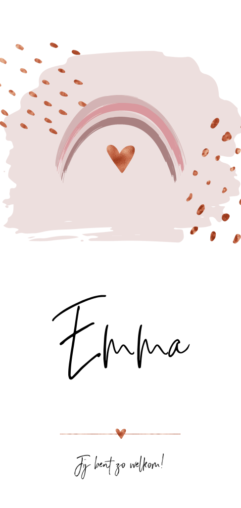 Vrolijke geboortekaart voor je dochtertje met een hippe roze regenboog gecombineerd met koperlook stipjes en hartjes. Verander de kleuren en schrijf je eigen teksten om zo de kaart persoonlijk te maken.