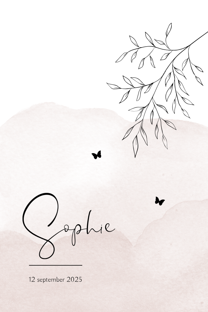 Gaaf geboortekaartje voor je dochter met een trendy clean ontwerp met een hippe pentekening van een takje en lieve vlindertjes. De watercolour wolk in een zacht roze pastel tint maakt dit geboortekaartje helemaal af!