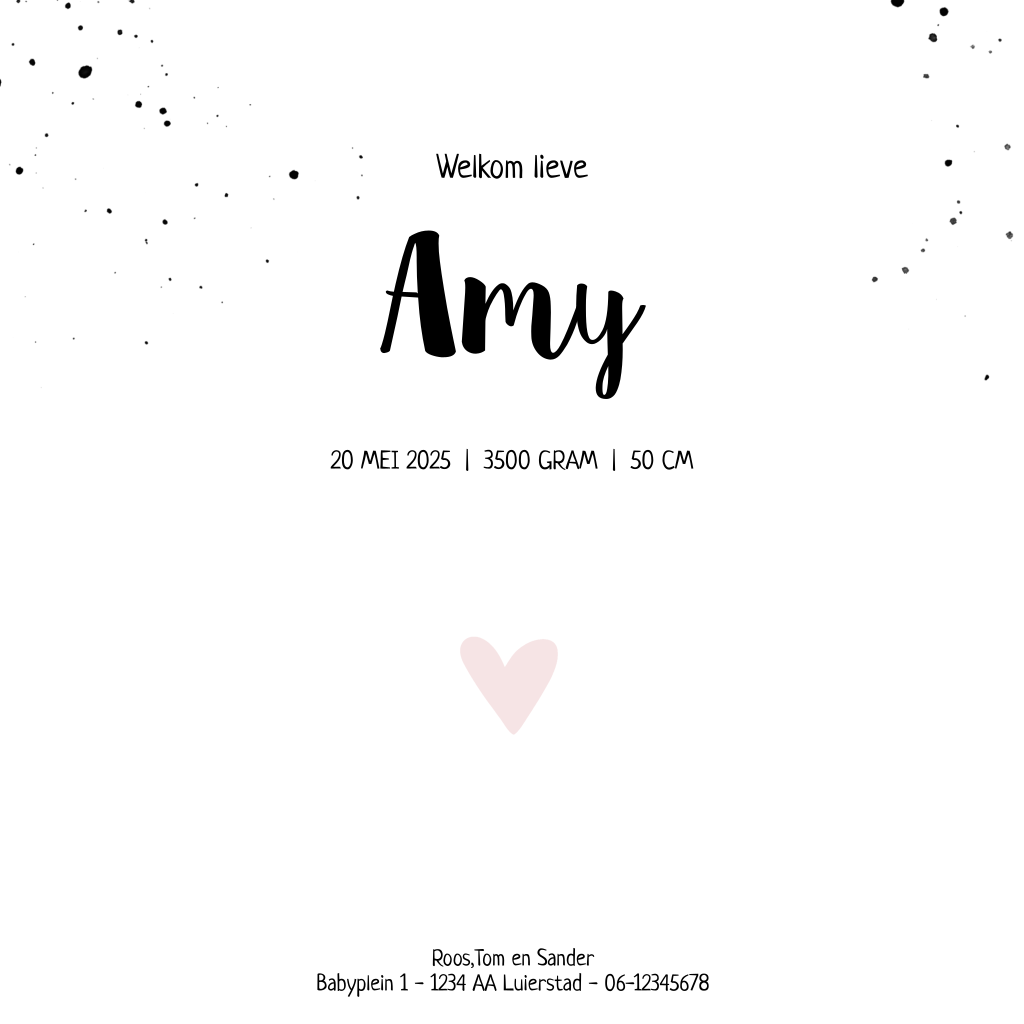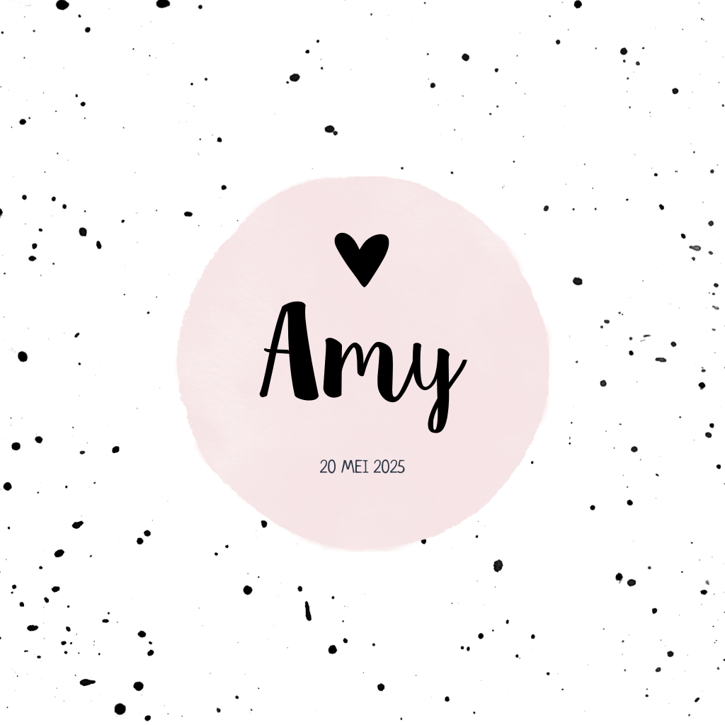 Dit hippe geboortekaartje heeft een zacht roze waterverf cirkel met daarom heen zwarte verf stipjes. Verander de kleuren en teksten en maak de kaart persoonlijk.