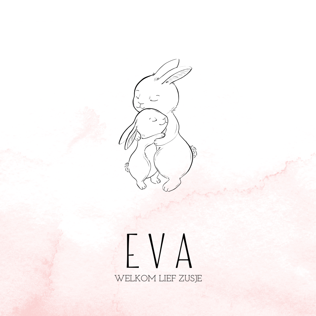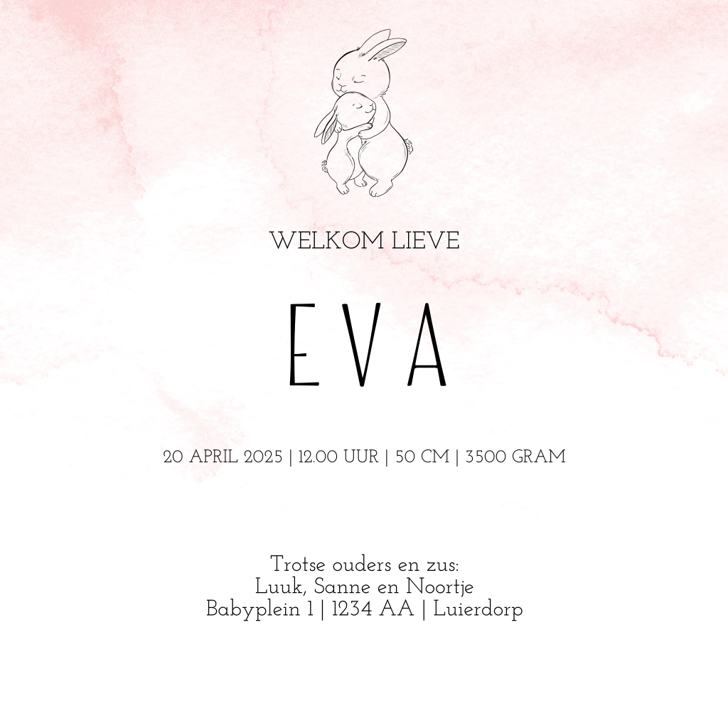 Een lief babykaartje voor de geboorte van je dochtertje, met twee konijntjes op een trendy roze waterverf achtergrond.