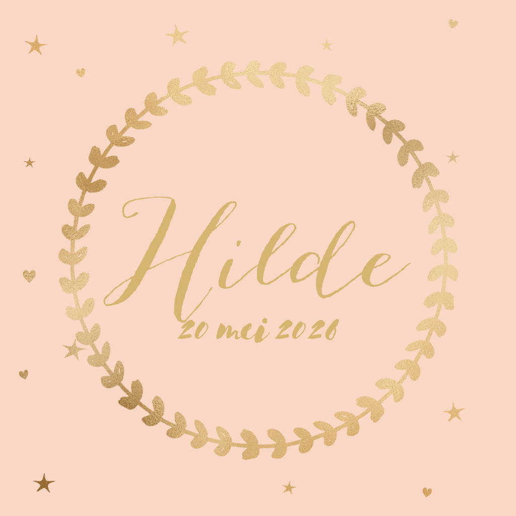 Hip geboortekaartje voor een meisje in goudlook en peach met een getekend kransje en confetti van hartjes en sterretjes.