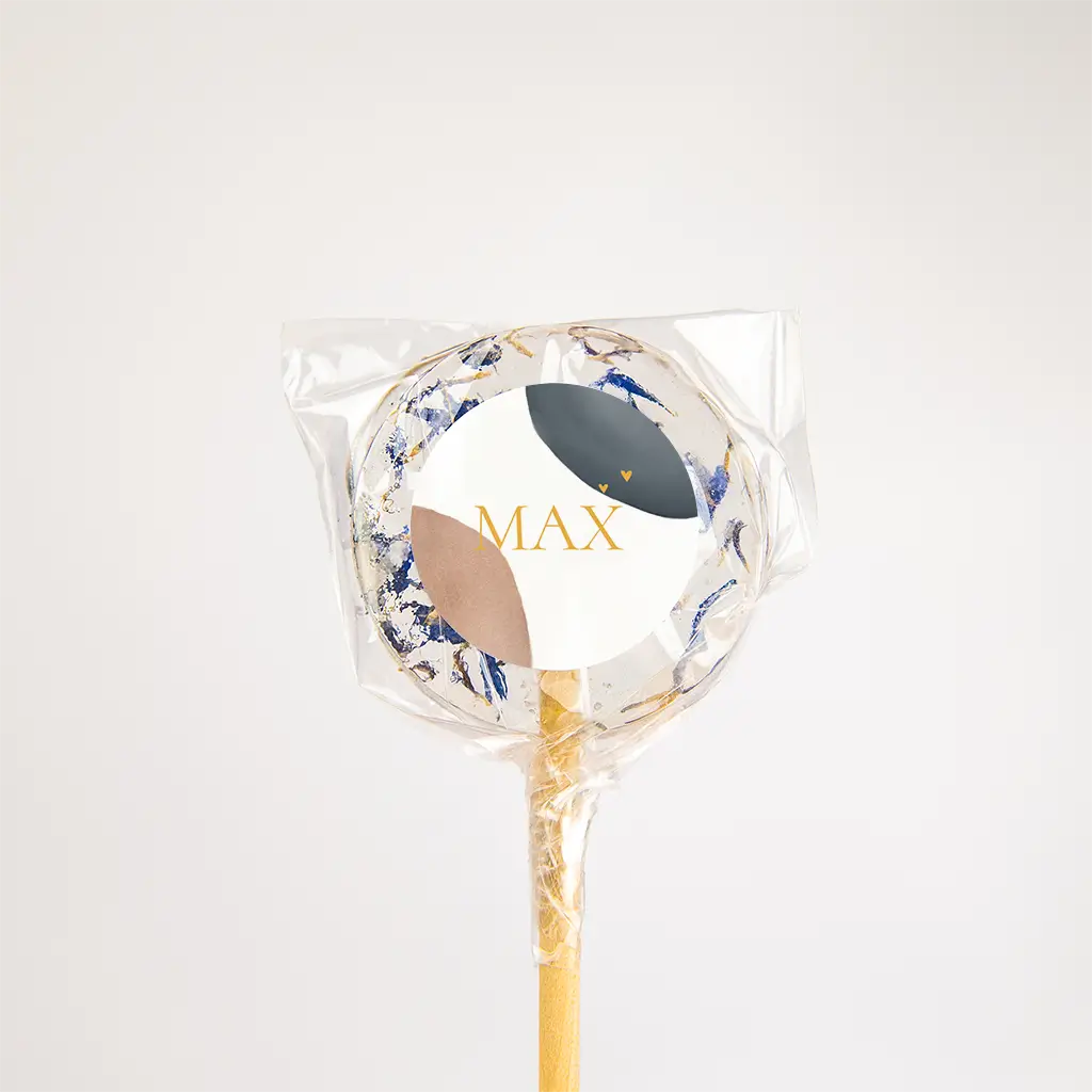 Een naamsticker met organische vormen en de naam van jullie kindje in het midden met twee kleine hartjes. Laat de sticker samen komen met het bijpassende geboortekaartje van Babyjewels en maak je geboorte aankondiging compleet.