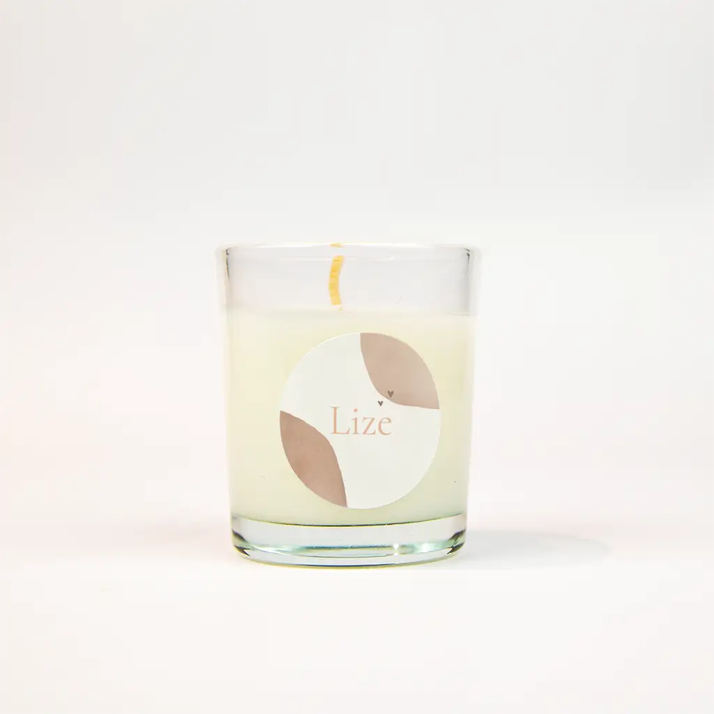 Sticker met organische vormen in zachte neutrale kleuren. De naam van jullie dochtertje staat in het midden van de sticker met twee kleine hartjes erbij. De sticker past bij het originele kaartje van Babyjewels "Roségoudfolie geboortekaartje met organische vormen van aquarel".