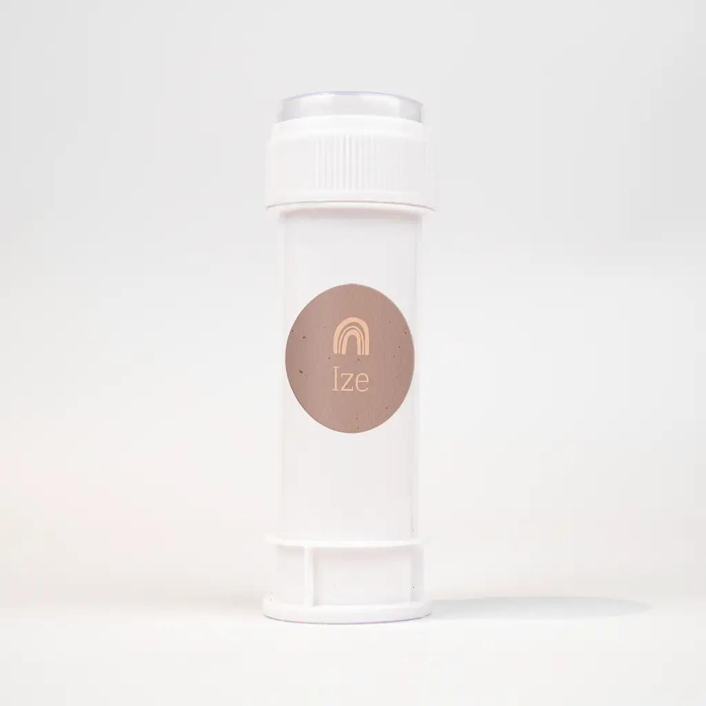 Sticker met roze achtergrond en schattige regenboog met daaronder de naam van jullie dochtertje. De sticker past bij het originele geboortekaartje van Babyjewels "Roségoudfolie geboortekaartje met regenboogje, hartjes en verfspetters".