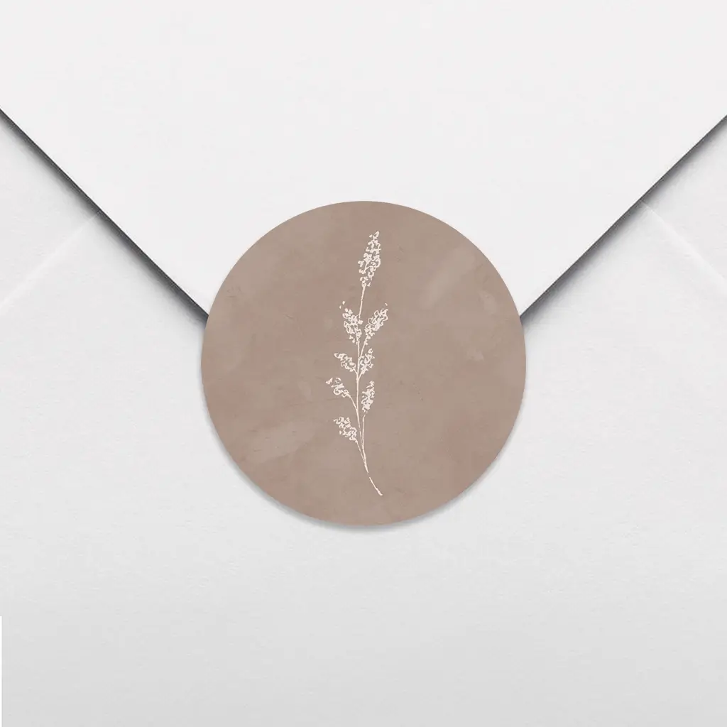 Lieve sluitsticker met een watercolour achtergond in een neutrale kleur. Op de sluitsticker staat een sierlijk takje. De sluitstickers hebben een diameter van 35 mm en worden geleverd op vellen van 25 stuks.