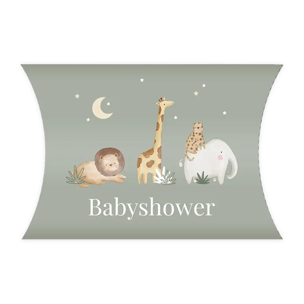 Een lief gondeldoosje als bedankje voor jouw gasten. Het doosje heeft een groene achtergrond met daarop een lieve jungledieren en een sterrenhemel. Pas het ontwerp naar wens aan in onze online editor.