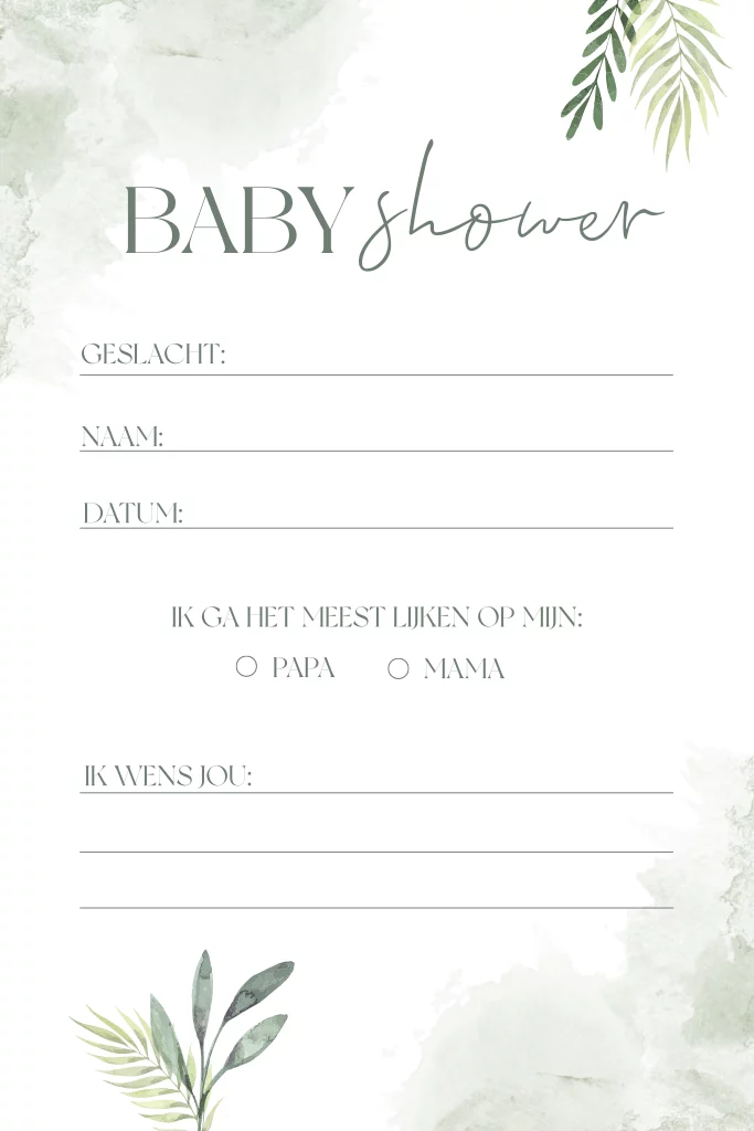 Voorspel samen met je familie en vrienden welk geslacht het is met onze invulkaarten. Deze kaarten zijn zelf te bewerken en in te vullen op de babyshower. Het kaartje heeft groene watercolour en junglebladeren. Heb je de bijpassende producten al gezien?