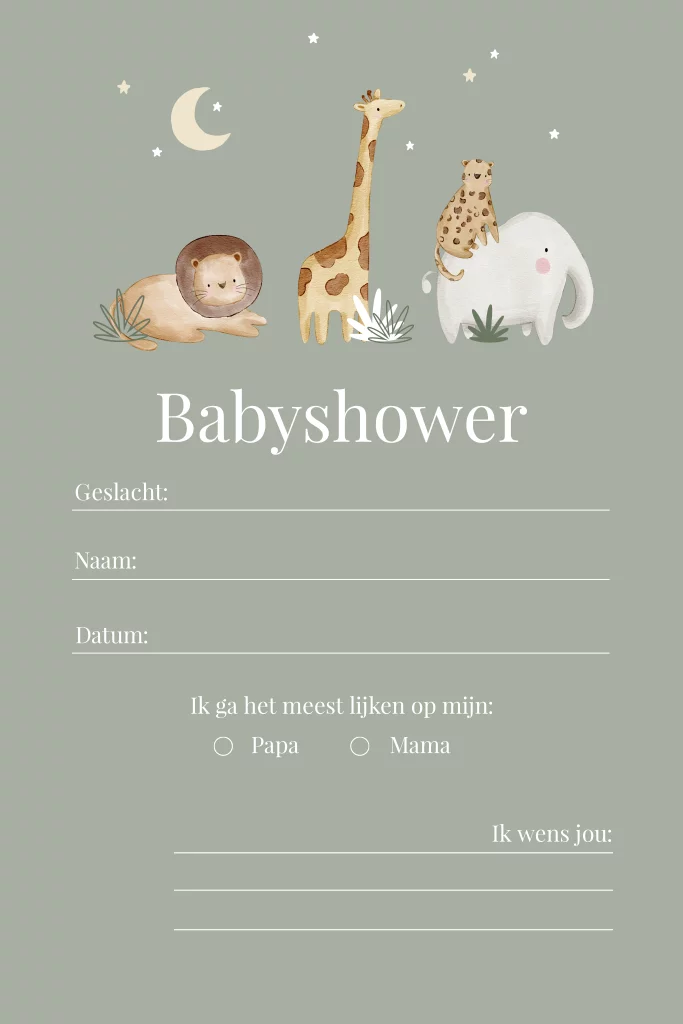 Voorspel samen met je familie en vrienden welk geslacht het is met onze invulkaarten. Deze kaarten zijn zelf te bewerken en in te vullen op de gender reveal. Het kaartje heeft een groene basis met daarop een lieve illustraties van jungledieren. Heb je de bijpassende producten al gezien?