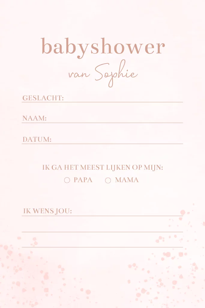 Voorspel samen met je familie en vrienden met onze invulkaarten. Deze kaarten zijn zelf te bewerken en in te vullen op de babyshower. Het kaartje heeft een roze watercolour basis. Heb je de bijpassende producten al gezien?
