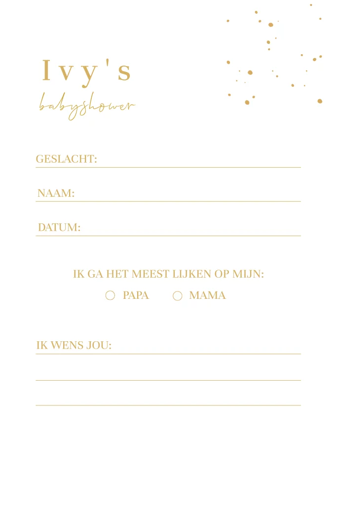Voorspel samen met je familie en vrienden welk geslacht het is met onze invulkaarten. Deze kaarten zijn zelf te bewerken en in te vullen op de gender reveal. Het kaartje heeft een witte basis met daarop een goudlook spetters. Heb je de bijpassende producten al gezien?