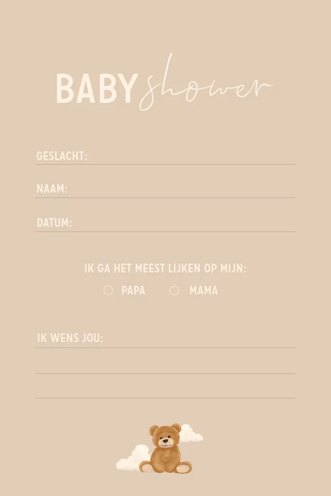 Voorspel samen met je familie en vrienden welk geslacht het is met onze invulkaarten. Deze kaarten zijn zelf te bewerken en in te vullen op de gender reveal. Het kaartje heeft een beige basis met daarop een lieve illustratie van een teddybeer. Heb je de bijpassende producten al gezien?