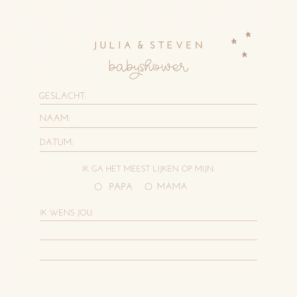Voorspel samen met je familie en vrienden welk geslacht het is met onze invulkaarten. Deze kaarten zijn zelf te bewerken en in te vullen op de gender reveal. Het kaartje heeft een beige basis met daarop lieve sterretjes. Heb je de bijpassende producten al gezien?
