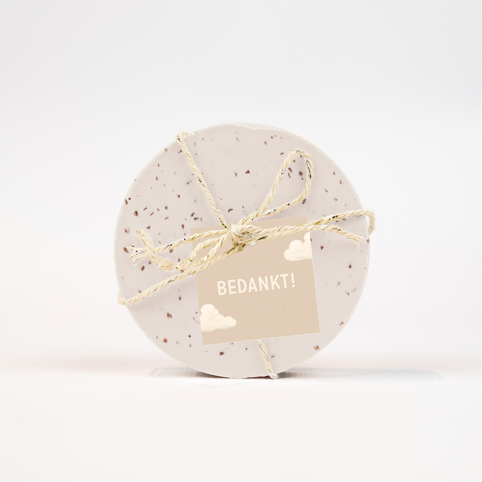 Bedank jouw gasten met een cadeautje. Maak het extra persoonlijk door dit labeltje toe te voegen. Dit labeltje heeft een beige achtergrond met wolkjes. Bewerk het vierkante labeltje in onze online editor en maak hem volledig naar je eigen wensen.