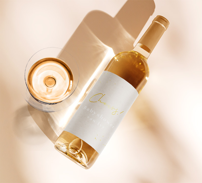 Maak de babyshower compleet met bijpassende wijnetiketten. Leuk als bedankje of voor op de wijnflessen op tafel. Het etiket heeft een beige achtergrond met goudfolie spetters en letters. Het etiket kan helemaal naar wens aangepast worden in onze online editor. Op één vel staan 5 wijnetiketten.
