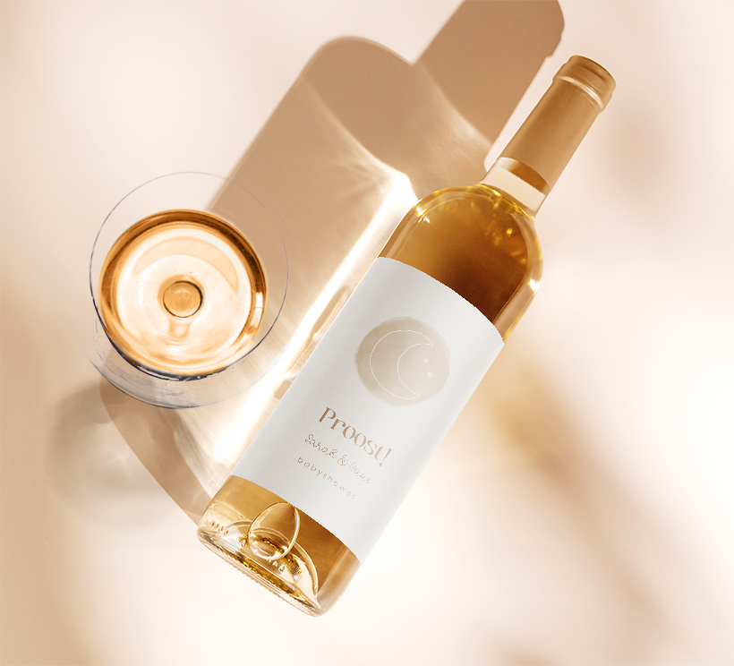 Maak de babyshower compleet met bijpassende wijnetiketten. Leuk als bedankje of voor op de wijnflessen op tafel. Het etiket heeft een beige achtergrond met een watercolour maan. Het etiket kan helemaal naar wens aangepast worden in onze online editor. Op één vel staan 5 wijnetiketten.