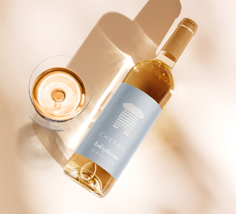 Maak de babyshower compleet met bijpassende wijnetiketten. Leuk als bedankje of voor op de wijnflessen op tafel. Het etiket heeft een blauw achtergrond met daarop een lieve illustratie van een rompertje. Het etiket kan helemaal naar wens aangepast worden in onze online editor. Op één vel staan 5 wijnetiketten.
