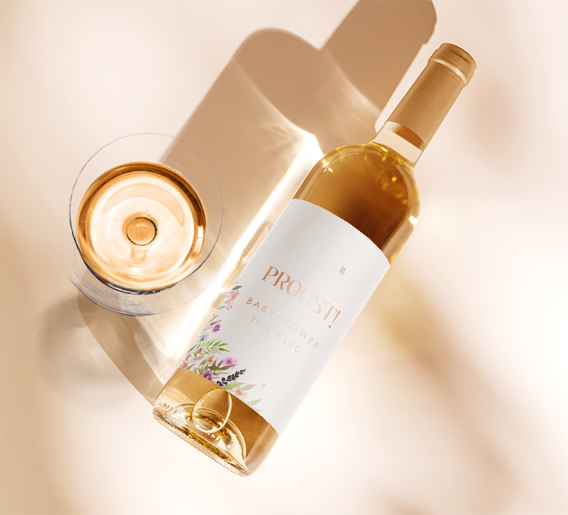 Maak de babyshower compleet met bijpassende wijnetiketten. Leuk als bedankje of voor op de wijnflessen op tafel. Het etiket heeft prachtige zomerse bloemen met roségoudfolie. Het etiket kan helemaal naar wens aangepast worden in onze online editor. Op één vel staan 5 wijnetiketten.