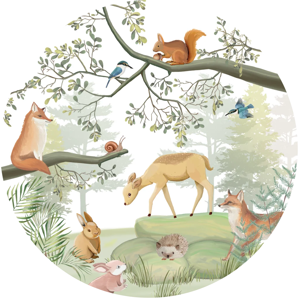 Maak de kinderkamer extra feestelijk met een behangcirkel! Op deze behangcirkel staan verschillende bosdieren geïllustreerd.