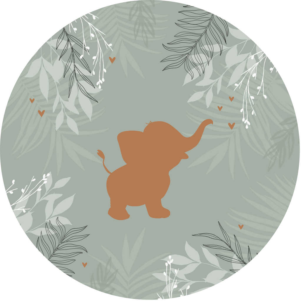 Maak de babykamer extra feestelijk met een behangcirkel! Deze behangcirkel heeft een groene achtergrond met takjes en het silhouet van een olifant.